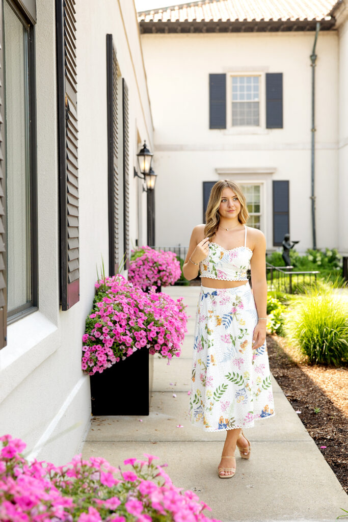 Emma’s Mom booked the gorgeous Grosse Pointe War memorial for our location. It has a beautiful garden, grounds, building and it’s on the water. Since I don’t often photograph on that side of town, it’s fun to go somewhere I’m not at often and it fit Emma’s vibe perfectly. We also headed to her high school for a few pictures as well. Not everyone has such a pretty high school but Grosse Pointe is full of charm!